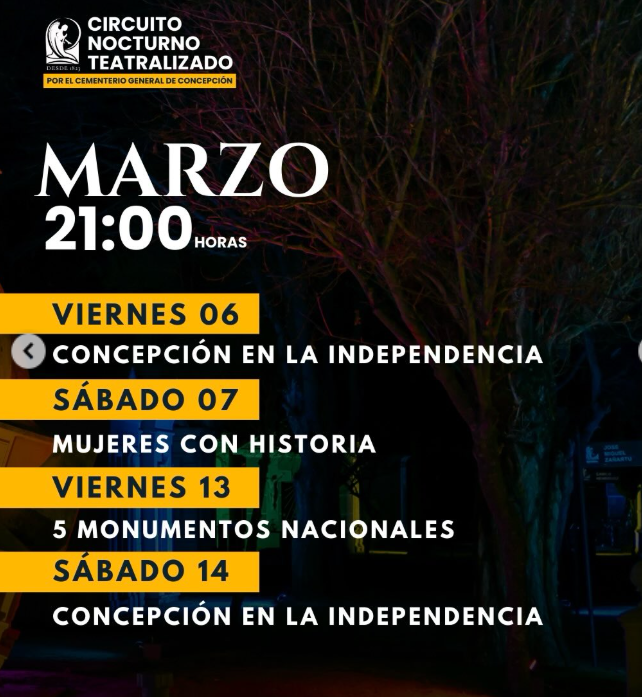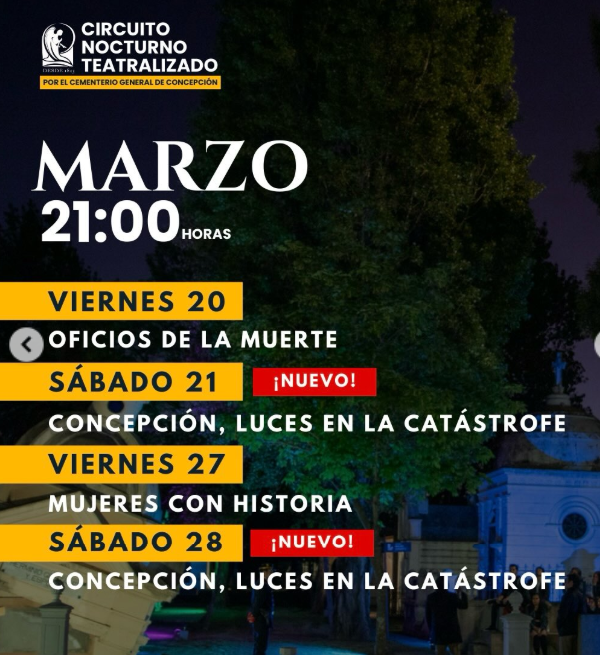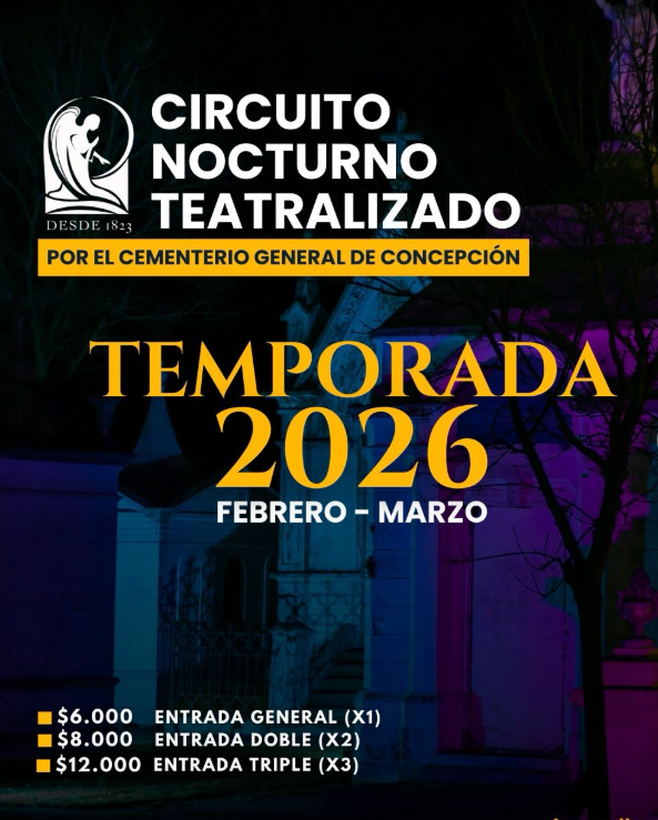 Esta actividad busca poner en valor el Cementerio General de Concepción, mediante un recorrido guiado y teatralizado por sus diferentes espacios. Las temporadas estivales de circuitos se realizan desde el 2016 y han tenido una excelente acogida por el público. Los circuitos se realizarán a público general en modalidad nocturna y de tarde, las fechas oficiales se publicarán en nuestras redes.